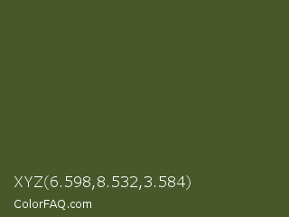 XYZ 6.598,8.532,3.584 Color is a dark green color and the nearest color is Woodland #4d5328. Hex code #48582b and RGB value is rgb(72,88,43). In RGB color space, this color is composed of 28% red, 35% green, 17% blue, In CMYK color space, this color is composed of 18% cyan, 0% magenta, 51% yellow , 65% black , In HSL color space, this color has a hue angle of 81° , 34% saturation and 26% lightness.