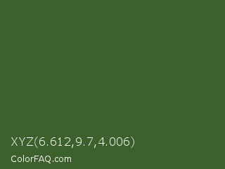 XYZ 6.612,9.7,4.006 Color is a dark green color and the nearest color is Mughal Green #306030. Hex code #3c612d and RGB value is rgb(60,97,45). In RGB color space, this color is composed of 24% red, 38% green, 18% blue, In CMYK color space, this color is composed of 38% cyan, 0% magenta, 54% yellow , 62% black , In HSL color space, this color has a hue angle of 103° , 37% saturation and 28% lightness.