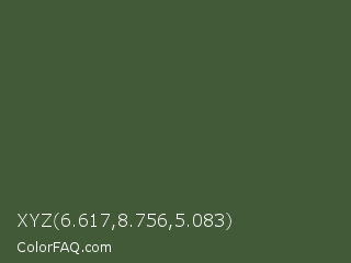 XYZ 6.617,8.756,5.083 Color is a dark green color and the nearest color is Tom Thumb #3f583b. Hex code #425a38 and RGB value is rgb(66,90,56). In RGB color space, this color is composed of 26% red, 35% green, 22% blue, In CMYK color space, this color is composed of 27% cyan, 0% magenta, 38% yellow , 65% black , In HSL color space, this color has a hue angle of 102° , 23% saturation and 29% lightness.