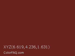 XYZ 6.619,4.236,1.631 Color is a dark red color and the nearest color is Persian Plum #701c1c. Hex code #69221d and RGB value is rgb(105,34,29). In RGB color space, this color is composed of 41% red, 13% green, 11% blue, In CMYK color space, this color is composed of 0% cyan, 68% magenta, 72% yellow , 59% black , In HSL color space, this color has a hue angle of 4° , 57% saturation and 26% lightness.