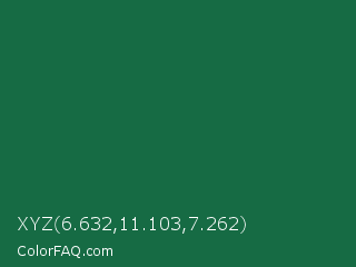 XYZ 6.632,11.103,7.262 Color is a dark green color and the nearest color is Jewel #126b40. Hex code #166b44 and RGB value is rgb(22,107,68). In RGB color space, this color is composed of 9% red, 42% green, 27% blue, In CMYK color space, this color is composed of 79% cyan, 0% magenta, 36% yellow , 58% black , In HSL color space, this color has a hue angle of 152° , 66% saturation and 25% lightness.