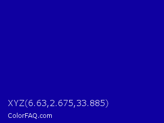 XYZ 6.63,2.675,33.885 Color is a normal indigo color and the nearest color is Duke Blue #00009c. Hex code #0f00a1 and RGB value is rgb(15,0,161). In RGB color space, this color is composed of 6% red, 0% green, 63% blue, In CMYK color space, this color is composed of 91% cyan, 100% magenta, 0% yellow , 37% black , In HSL color space, this color has a hue angle of 246° , 100% saturation and 32% lightness.