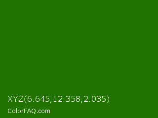 XYZ 6.645,12.358,2.035 Color is a very dark green color and the nearest color is Napier Green #2a8000. Hex code #217200 and RGB value is rgb(33,114,0). In RGB color space, this color is composed of 13% red, 45% green, 0% blue, In CMYK color space, this color is composed of 71% cyan, 0% magenta, 100% yellow , 55% black , In HSL color space, this color has a hue angle of 103° , 100% saturation and 22% lightness.
