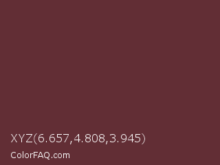 XYZ 6.657,4.808,3.945 Color is a dark red color and the nearest color is Buccaneer #622f30. Hex code #622e35 and RGB value is rgb(98,46,53). In RGB color space, this color is composed of 38% red, 18% green, 21% blue, In CMYK color space, this color is composed of 0% cyan, 53% magenta, 46% yellow , 62% black , In HSL color space, this color has a hue angle of 352° , 36% saturation and 28% lightness.