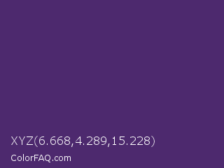 XYZ 6.668,4.289,15.228 Color is a dark purple color and the nearest color is Honey Flower #4f1c70. Hex code #4d296e and RGB value is rgb(77,41,110). In RGB color space, this color is composed of 30% red, 16% green, 43% blue, In CMYK color space, this color is composed of 30% cyan, 63% magenta, 0% yellow , 57% black , In HSL color space, this color has a hue angle of 271° , 46% saturation and 30% lightness.
