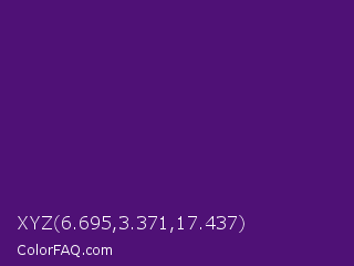 XYZ 6.695,3.371,17.437 Color is a dark purple color and the nearest color is Honey Flower #4f1c70. Hex code #4f1176 and RGB value is rgb(79,17,118). In RGB color space, this color is composed of 31% red, 7% green, 46% blue, In CMYK color space, this color is composed of 33% cyan, 86% magenta, 0% yellow , 54% black , In HSL color space, this color has a hue angle of 277° , 75% saturation and 26% lightness.