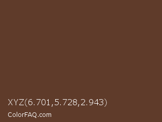 XYZ 6.701,5.728,2.943 Color is a dark orange color and the nearest color is Irish Coffee #5f3d26. Hex code #5f3b2a and RGB value is rgb(95,59,42). In RGB color space, this color is composed of 37% red, 23% green, 16% blue, In CMYK color space, this color is composed of 0% cyan, 38% magenta, 56% yellow , 63% black , In HSL color space, this color has a hue angle of 19° , 39% saturation and 27% lightness.