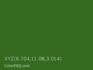 XYZ 6.704,11.08,3.014 Color is a dark green color and the nearest color is Dell #396413. Hex code #326a1e and RGB value is rgb(50,106,30). In RGB color space, this color is composed of 20% red, 42% green, 12% blue, In CMYK color space, this color is composed of 53% cyan, 0% magenta, 72% yellow , 58% black , In HSL color space, this color has a hue angle of 104° , 56% saturation and 27% lightness.