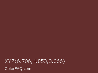 XYZ 6.706,4.853,3.066 Color is a dark red color and the nearest color is Buccaneer #622f30. Hex code #642e2d and RGB value is rgb(100,46,45). In RGB color space, this color is composed of 39% red, 18% green, 18% blue, In CMYK color space, this color is composed of 0% cyan, 54% magenta, 55% yellow , 61% black , In HSL color space, this color has a hue angle of 1° , 38% saturation and 28% lightness.