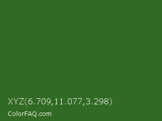 XYZ 6.709,11.077,3.298 Color is a dark green color and the nearest color is Mughal Green #306030. Hex code #316a22 and RGB value is rgb(49,106,34). In RGB color space, this color is composed of 19% red, 42% green, 13% blue, In CMYK color space, this color is composed of 54% cyan, 0% magenta, 68% yellow , 58% black , In HSL color space, this color has a hue angle of 108° , 51% saturation and 27% lightness.