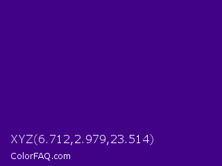 XYZ 6.712,2.979,23.514 Color is a dark violet color and the nearest color is Kingfisher Daisy #3e0480. Hex code #420288 and RGB value is rgb(66,2,136). In RGB color space, this color is composed of 26% red, 1% green, 53% blue, In CMYK color space, this color is composed of 51% cyan, 99% magenta, 0% yellow , 47% black , In HSL color space, this color has a hue angle of 269° , 97% saturation and 27% lightness.