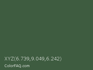 XYZ 6.739,9.049,6.242 Color is a dark green color and the nearest color is Tom Thumb #3f583b. Hex code #3e5c40 and RGB value is rgb(62,92,64). In RGB color space, this color is composed of 24% red, 36% green, 25% blue, In CMYK color space, this color is composed of 33% cyan, 0% magenta, 30% yellow , 64% black , In HSL color space, this color has a hue angle of 124° , 19% saturation and 30% lightness.