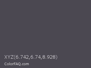 XYZ 6.742,6.74,8.928 Color is a dark indigo color and the nearest color is Quartz #51484f. Hex code #4b4852 and RGB value is rgb(75,72,82). In RGB color space, this color is composed of 29% red, 28% green, 32% blue, In CMYK color space, this color is composed of 9% cyan, 12% magenta, 0% yellow , 68% black , In HSL color space, this color has a hue angle of 258° , 6% saturation and 30% lightness.