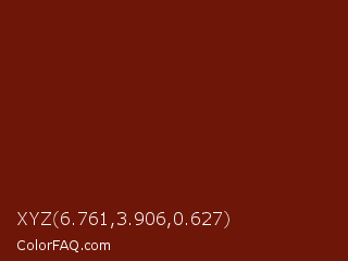 XYZ 6.761,3.906,0.627 Color is a dark red color and the nearest color is Cedar Wood Finish #711a00. Hex code #6e1608 and RGB value is rgb(110,22,8). In RGB color space, this color is composed of 43% red, 9% green, 3% blue, In CMYK color space, this color is composed of 0% cyan, 80% magenta, 93% yellow , 57% black , In HSL color space, this color has a hue angle of 8° , 86% saturation and 23% lightness.