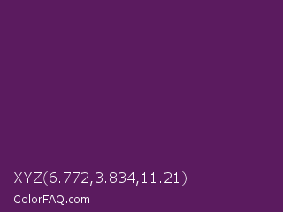 XYZ 6.772,3.834,11.21 Color is a dark magenta color and the nearest color is Palatinate Purple #682860. Hex code #5b1b5f and RGB value is rgb(91,27,95). In RGB color space, this color is composed of 36% red, 11% green, 37% blue, In CMYK color space, this color is composed of 4% cyan, 72% magenta, 0% yellow , 63% black , In HSL color space, this color has a hue angle of 296° , 56% saturation and 24% lightness.