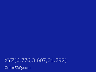 XYZ 6.776,3.607,31.792 Color is a normal blue color and the nearest color is Torea Bay #0f2d9e. Hex code #11219c and RGB value is rgb(17,33,156). In RGB color space, this color is composed of 7% red, 13% green, 61% blue, In CMYK color space, this color is composed of 89% cyan, 79% magenta, 0% yellow , 39% black , In HSL color space, this color has a hue angle of 233° , 80% saturation and 34% lightness.