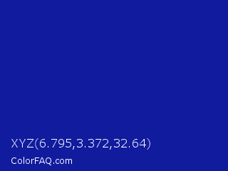XYZ 6.795,3.372,32.64 Color is a normal blue color and the nearest color is Indigo Dye #091f92. Hex code #111b9e and RGB value is rgb(17,27,158). In RGB color space, this color is composed of 7% red, 11% green, 62% blue, In CMYK color space, this color is composed of 89% cyan, 83% magenta, 0% yellow , 38% black , In HSL color space, this color has a hue angle of 236° , 81% saturation and 34% lightness.