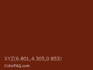 XYZ 6.801,4.305,0.853 Color is a dark red color and the nearest color is Moccaccino #6e1d14. Hex code #6c210d and RGB value is rgb(108,33,13). In RGB color space, this color is composed of 42% red, 13% green, 5% blue, In CMYK color space, this color is composed of 0% cyan, 69% magenta, 88% yellow , 58% black , In HSL color space, this color has a hue angle of 13° , 79% saturation and 24% lightness.
