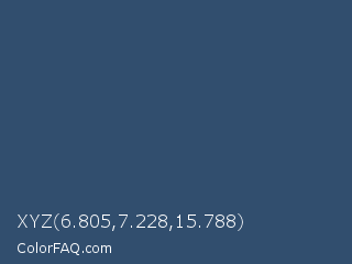 XYZ 6.805,7.228,15.788 Color is a normal blue color and the nearest color is San Juan #304b6a. Hex code #314e6e and RGB value is rgb(49,78,110). In RGB color space, this color is composed of 19% red, 31% green, 43% blue, In CMYK color space, this color is composed of 55% cyan, 29% magenta, 0% yellow , 57% black , In HSL color space, this color has a hue angle of 211° , 38% saturation and 31% lightness.