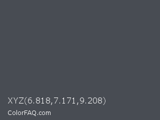 XYZ 6.818,7.171,9.208 Color is a dark blue color and the nearest color is Mako #444954. Hex code #484c53 and RGB value is rgb(72,76,83). In RGB color space, this color is composed of 28% red, 30% green, 33% blue, In CMYK color space, this color is composed of 13% cyan, 8% magenta, 0% yellow , 67% black , In HSL color space, this color has a hue angle of 218° , 7% saturation and 30% lightness.