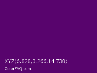 XYZ 6.828,3.266,14.738 Color is a very dark purple color and the nearest color is Pigment Indigo #4b0082. Hex code #58046d and RGB value is rgb(88,4,109). In RGB color space, this color is composed of 35% red, 2% green, 43% blue, In CMYK color space, this color is composed of 19% cyan, 96% magenta, 0% yellow , 57% black , In HSL color space, this color has a hue angle of 288° , 93% saturation and 22% lightness.