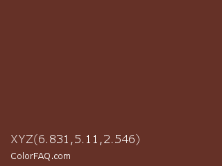 XYZ 6.831,5.11,2.546 Color is a dark red color and the nearest color is Buccaneer #622f30. Hex code #653127 and RGB value is rgb(101,49,39). In RGB color space, this color is composed of 40% red, 19% green, 15% blue, In CMYK color space, this color is composed of 0% cyan, 51% magenta, 61% yellow , 60% black , In HSL color space, this color has a hue angle of 10° , 44% saturation and 27% lightness.