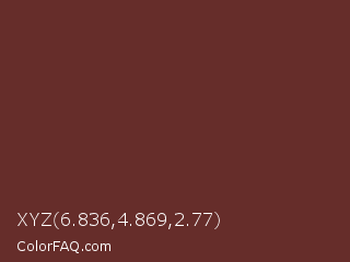 XYZ 6.836,4.869,2.77 Color is a dark red color and the nearest color is Buccaneer #622f30. Hex code #662d2a and RGB value is rgb(102,45,42). In RGB color space, this color is composed of 40% red, 18% green, 16% blue, In CMYK color space, this color is composed of 0% cyan, 56% magenta, 59% yellow , 60% black , In HSL color space, this color has a hue angle of 3° , 42% saturation and 28% lightness.