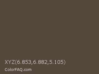 XYZ 6.853,6.882,5.105 Color is a dark orange color and the nearest color is Kabul #5e483e. Hex code #55483b and RGB value is rgb(85,72,59). In RGB color space, this color is composed of 33% red, 28% green, 23% blue, In CMYK color space, this color is composed of 0% cyan, 15% magenta, 31% yellow , 67% black , In HSL color space, this color has a hue angle of 30° , 18% saturation and 28% lightness.