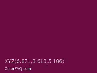 XYZ 6.871,3.613,5.186 Color is a dark magenta color and the nearest color is Tyrian Purple #66023c. Hex code #690b40 and RGB value is rgb(105,11,64). In RGB color space, this color is composed of 41% red, 4% green, 25% blue, In CMYK color space, this color is composed of 0% cyan, 90% magenta, 39% yellow , 59% black , In HSL color space, this color has a hue angle of 326° , 81% saturation and 23% lightness.