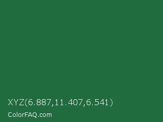 XYZ 6.887,11.407,6.541 Color is a dark green color and the nearest color is Green Pea #1d6142. Hex code #216c3f and RGB value is rgb(33,108,63). In RGB color space, this color is composed of 13% red, 42% green, 25% blue, In CMYK color space, this color is composed of 69% cyan, 0% magenta, 42% yellow , 58% black , In HSL color space, this color has a hue angle of 144° , 53% saturation and 28% lightness.