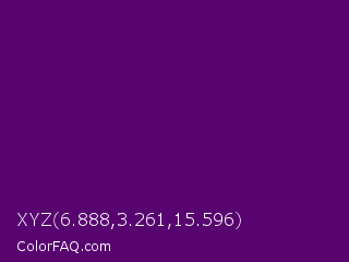 XYZ 6.888,3.261,15.596 Color is a dark purple color and the nearest color is Pigment Indigo #4b0082. Hex code #570370 and RGB value is rgb(87,3,112). In RGB color space, this color is composed of 34% red, 1% green, 44% blue, In CMYK color space, this color is composed of 22% cyan, 97% magenta, 0% yellow , 56% black , In HSL color space, this color has a hue angle of 286° , 95% saturation and 23% lightness.