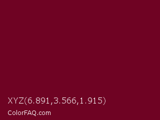 XYZ 6.891,3.566,1.915 Color is a very dark rose color and the nearest color is Black Rose #67032d. Hex code #6f0323 and RGB value is rgb(111,3,35). In RGB color space, this color is composed of 44% red, 1% green, 14% blue, In CMYK color space, this color is composed of 0% cyan, 97% magenta, 68% yellow , 56% black , In HSL color space, this color has a hue angle of 342° , 95% saturation and 22% lightness.