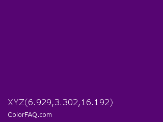 XYZ 6.929,3.302,16.192 Color is a dark purple color and the nearest color is Pigment Indigo #4b0082. Hex code #560572 and RGB value is rgb(86,5,114). In RGB color space, this color is composed of 34% red, 2% green, 45% blue, In CMYK color space, this color is composed of 25% cyan, 96% magenta, 0% yellow , 55% black , In HSL color space, this color has a hue angle of 285° , 92% saturation and 23% lightness.
