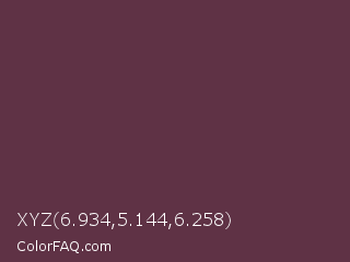 XYZ 6.934,5.144,6.258 Color is a dark rose color and the nearest color is Wine Dregs #673147. Hex code #5f3245 and RGB value is rgb(95,50,69). In RGB color space, this color is composed of 37% red, 20% green, 27% blue, In CMYK color space, this color is composed of 0% cyan, 47% magenta, 27% yellow , 63% black , In HSL color space, this color has a hue angle of 335° , 31% saturation and 28% lightness.