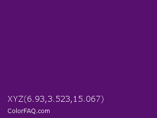 XYZ 6.93,3.523,15.067 Color is a dark purple color and the nearest color is Honey Flower #4f1c70. Hex code #57106e and RGB value is rgb(87,16,110). In RGB color space, this color is composed of 34% red, 6% green, 43% blue, In CMYK color space, this color is composed of 21% cyan, 85% magenta, 0% yellow , 57% black , In HSL color space, this color has a hue angle of 285° , 75% saturation and 25% lightness.