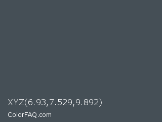 XYZ 6.93,7.529,9.892 Color is a dark blue color and the nearest color is River Bed #434c59. Hex code #454f56 and RGB value is rgb(69,79,86). In RGB color space, this color is composed of 27% red, 31% green, 34% blue, In CMYK color space, this color is composed of 20% cyan, 8% magenta, 0% yellow , 66% black , In HSL color space, this color has a hue angle of 205° , 11% saturation and 30% lightness.
