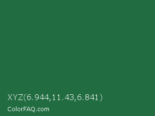 XYZ 6.944,11.43,6.841 Color is a dark green color and the nearest color is Green Pea #1d6142. Hex code #216c41 and RGB value is rgb(33,108,65). In RGB color space, this color is composed of 13% red, 42% green, 25% blue, In CMYK color space, this color is composed of 69% cyan, 0% magenta, 40% yellow , 58% black , In HSL color space, this color has a hue angle of 146° , 53% saturation and 28% lightness.