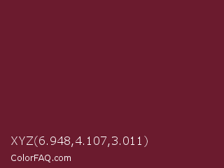 XYZ 6.948,4.107,3.011 Color is a dark red color and the nearest color is Persian Plum #701c1c. Hex code #6b1b2e and RGB value is rgb(107,27,46). In RGB color space, this color is composed of 42% red, 11% green, 18% blue, In CMYK color space, this color is composed of 0% cyan, 75% magenta, 57% yellow , 58% black , In HSL color space, this color has a hue angle of 346° , 60% saturation and 26% lightness.