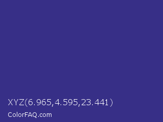 XYZ 6.965,4.595,23.441 Color is a normal indigo color and the nearest color is Cosmic Cobalt #2e2d88. Hex code #372f87 and RGB value is rgb(55,47,135). In RGB color space, this color is composed of 22% red, 18% green, 53% blue, In CMYK color space, this color is composed of 59% cyan, 65% magenta, 0% yellow , 47% black , In HSL color space, this color has a hue angle of 245° , 48% saturation and 36% lightness.