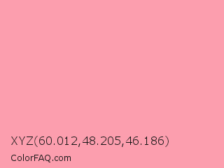 XYZ 60.012,48.205,46.186 Color is a light red color and the nearest color is Wewak #f19bab. Hex code #fc9eae and RGB value is rgb(252,158,174). In RGB color space, this color is composed of 99% red, 62% green, 68% blue, In CMYK color space, this color is composed of 0% cyan, 37% magenta, 31% yellow , 1% black , In HSL color space, this color has a hue angle of 350° , 94% saturation and 80% lightness.