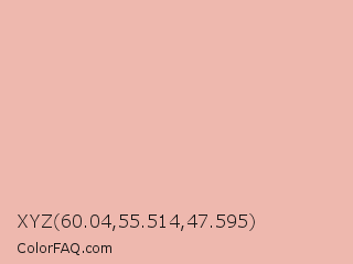 XYZ 60.04,55.514,47.595 Color is a very light red color and the nearest color is Shilo #e8b9b3. Hex code #eeb8ae and RGB value is rgb(238,184,174). In RGB color space, this color is composed of 93% red, 72% green, 68% blue, In CMYK color space, this color is composed of 0% cyan, 23% magenta, 27% yellow , 7% black , In HSL color space, this color has a hue angle of 9° , 65% saturation and 81% lightness.