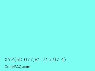 XYZ 60.077,81.715,97.4 Color is a light cyan color and the nearest color is Electric Blue #7df9ff. Hex code #7dfef3 and RGB value is rgb(125,254,243). In RGB color space, this color is composed of 49% red, 100% green, 95% blue, In CMYK color space, this color is composed of 51% cyan, 0% magenta, 4% yellow , 0% black , In HSL color space, this color has a hue angle of 175° , 98% saturation and 74% lightness.