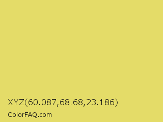 XYZ 60.087,68.68,23.186 Color is a light yellow color and the nearest color is Straw #e4d96f. Hex code #e4dc68 and RGB value is rgb(228,220,104). In RGB color space, this color is composed of 89% red, 86% green, 41% blue, In CMYK color space, this color is composed of 0% cyan, 4% magenta, 54% yellow , 11% black , In HSL color space, this color has a hue angle of 56° , 70% saturation and 65% lightness.