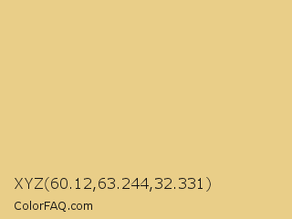 XYZ 60.12,63.244,32.331 Color is a light orange color and the nearest color is Putty #e7cd8c. Hex code #e9ce88 and RGB value is rgb(233,206,136). In RGB color space, this color is composed of 91% red, 81% green, 53% blue, In CMYK color space, this color is composed of 0% cyan, 12% magenta, 42% yellow , 9% black , In HSL color space, this color has a hue angle of 43° , 69% saturation and 72% lightness.