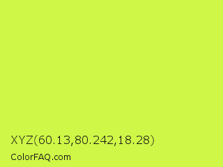XYZ 60.13,80.242,18.28 Color is a light lime color and the nearest color is Maximum Green Yellow #d9e650. Hex code #cff747 and RGB value is rgb(207,247,71). In RGB color space, this color is composed of 81% red, 97% green, 28% blue, In CMYK color space, this color is composed of 16% cyan, 0% magenta, 71% yellow , 3% black , In HSL color space, this color has a hue angle of 74° , 92% saturation and 62% lightness.