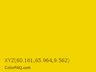 XYZ 60.161,65.964,9.562 Color is a normal yellow color and the nearest color is Safety Yellow #eed202. Hex code #f2d400 and RGB value is rgb(242,212,0). In RGB color space, this color is composed of 95% red, 83% green, 0% blue, In CMYK color space, this color is composed of 0% cyan, 12% magenta, 100% yellow , 5% black , In HSL color space, this color has a hue angle of 53° , 100% saturation and 47% lightness.