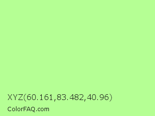 XYZ 60.161,83.482,40.96 Color is a light green color and the nearest color is Reef #c9ffa2. Hex code #b5ff94 and RGB value is rgb(181,255,148). In RGB color space, this color is composed of 71% red, 100% green, 58% blue, In CMYK color space, this color is composed of 29% cyan, 0% magenta, 42% yellow , 0% black , In HSL color space, this color has a hue angle of 101° , 100% saturation and 79% lightness.