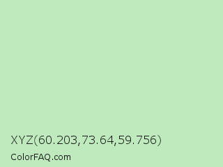 XYZ 60.203,73.64,59.756 Color is a very light green color and the nearest color is Madang #b7f0be. Hex code #bfeabe and RGB value is rgb(191,234,190). In RGB color space, this color is composed of 75% red, 92% green, 75% blue, In CMYK color space, this color is composed of 18% cyan, 0% magenta, 19% yellow , 8% black , In HSL color space, this color has a hue angle of 119° , 51% saturation and 83% lightness.