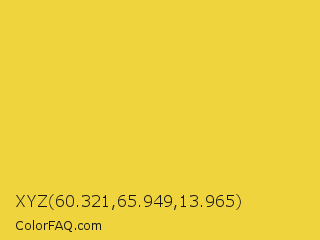 XYZ 60.321,65.949,13.965 Color is a normal yellow color and the nearest color is Sandstorm #ecd540. Hex code #f0d43d and RGB value is rgb(240,212,61). In RGB color space, this color is composed of 94% red, 83% green, 24% blue, In CMYK color space, this color is composed of 0% cyan, 12% magenta, 75% yellow , 6% black , In HSL color space, this color has a hue angle of 51° , 86% saturation and 59% lightness.