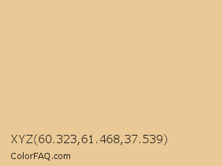 XYZ 60.323,61.468,37.539 Color is a light orange color and the nearest color is Putty #e7cd8c. Hex code #eac996 and RGB value is rgb(234,201,150). In RGB color space, this color is composed of 92% red, 79% green, 59% blue, In CMYK color space, this color is composed of 0% cyan, 14% magenta, 36% yellow , 8% black , In HSL color space, this color has a hue angle of 36° , 67% saturation and 75% lightness.